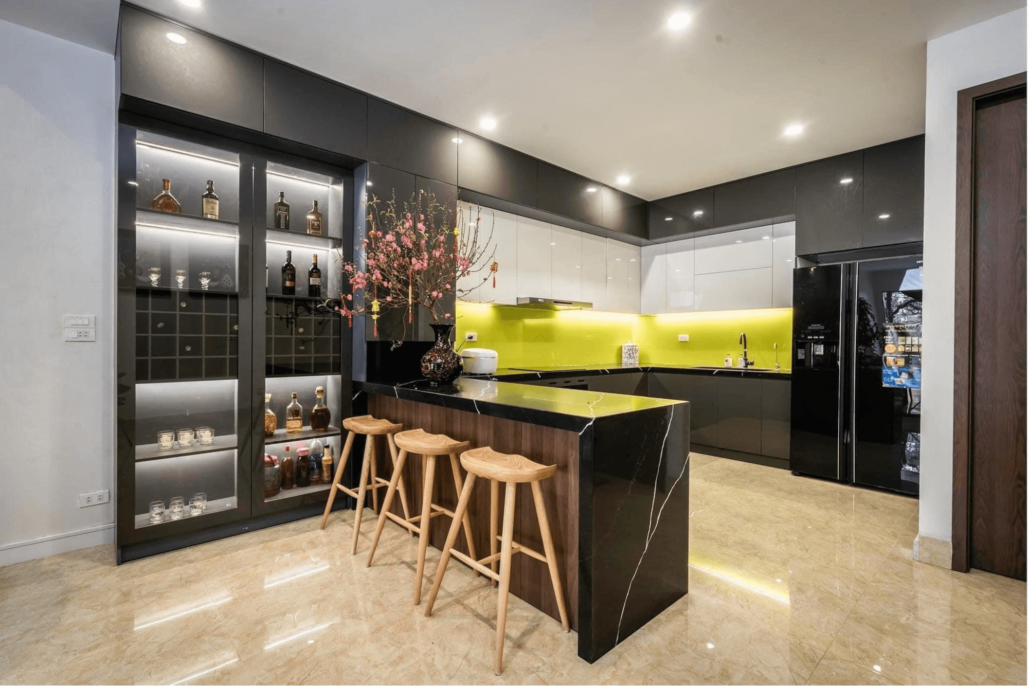 - Tủ bếp thông minh: Tích hợp các tiện ích hiện đại như đèn cảm ứng, tủ lạnh âm, hay hệ thống đỏ tự động.