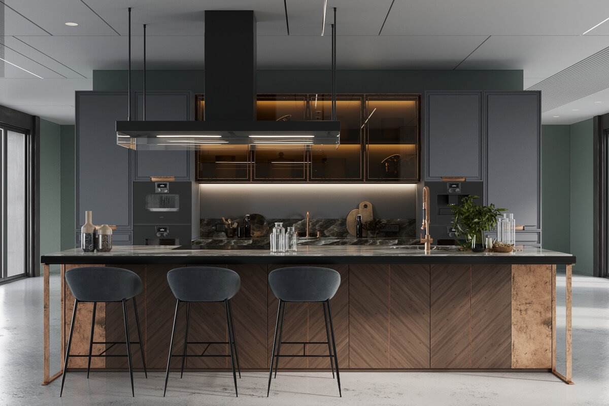 Phong cách công nghiệp thường sử dụng các vật liệu thô như bê tông, sắt, gỗ mộc. Tủ bếp nhôm kính màu xám trong phong cách này sẽ tạo cảm giác mạnh mẽ, ấn tượng. Sự kết hợp giữa màu xám và các gam màu tối như đen, nâu sẽ tạo nên sự cá tính và độc đáo cho không gian bếp.